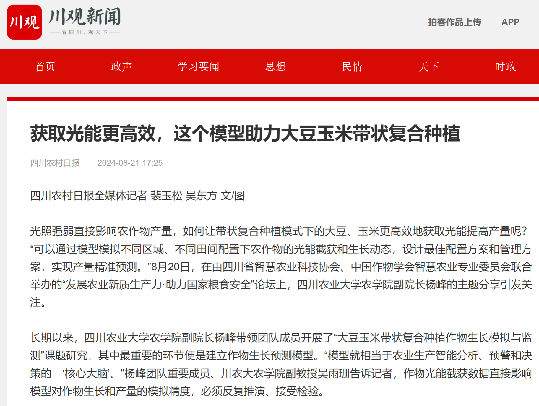 光照强弱直接影响农作物产量,如何让带状复合种植模式下的大豆、玉米更高效地获取光能提高产量呢?“可以通过模型模拟不同区域、不同田间配置下农作物的光能截获和生长动态,设计最佳配置方案和管理方案,实现产量精准预测。”8月20日,在由四川省智慧农业科技协会、中国作物学会智慧农业专业委员会联合举办的“发展农业新质生产力·助力国家粮食安全”论坛上,best365官方网站登录入口best365官方网站登录入口副院长杨峰的主题分享引发关注。