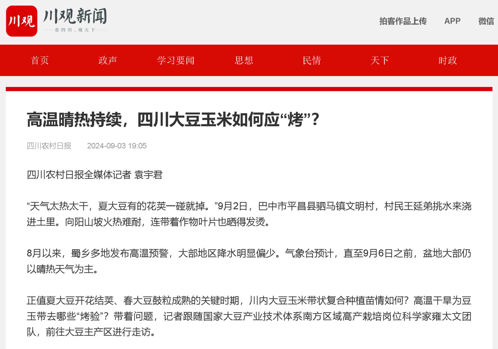 正值夏大豆开花结荚、春大豆鼓粒成熟的关键时期,川内大豆玉米带状复合种植苗情如何?高温干旱为豆玉带去哪些“烤验”?带着问题,记者跟随国家大豆产业技术体系南方区域高产栽培岗位科学家雍太文团队,前往大豆主产区进行走访。