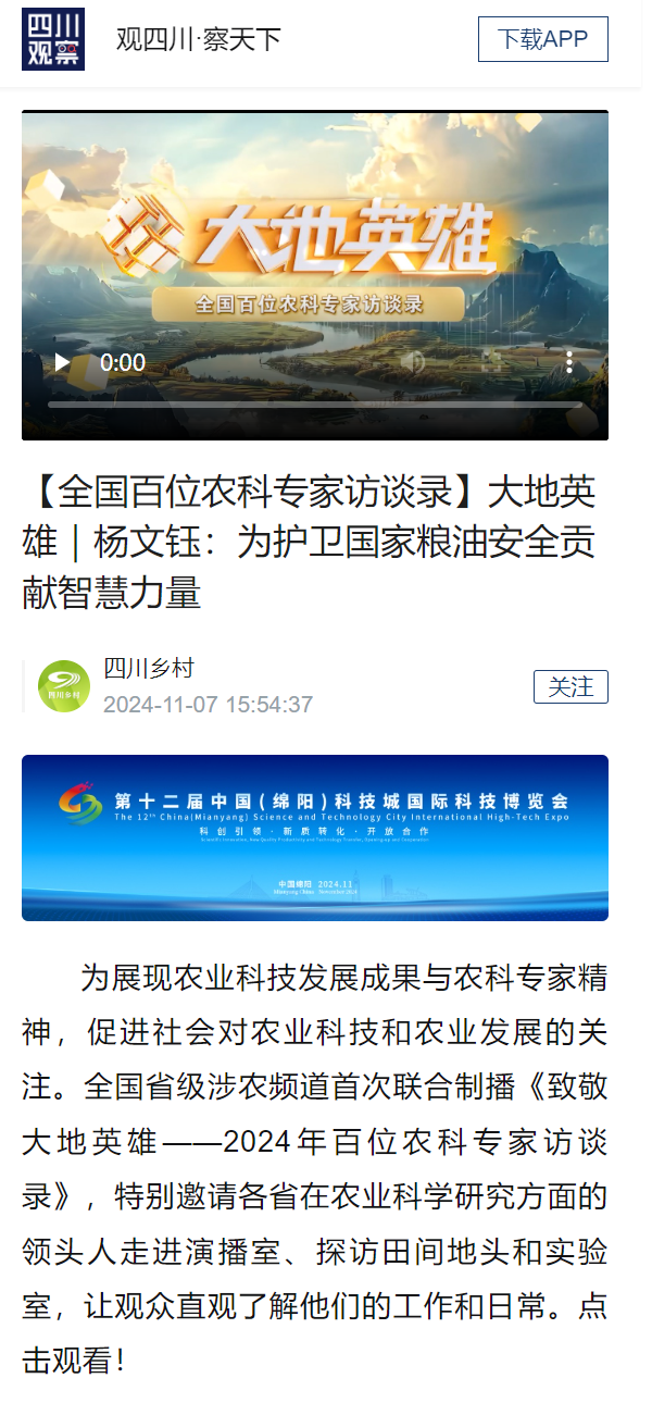 为展现农业科技发展成果与农科专家精神,促进社会对农业科技和农业发展的关注。全国省级涉农频道首次联合制播《致敬大地英雄——2024年百位农科专家访谈录》,特别邀请各省在农业科学研究方面的领头人走进演播室、探访田间地头和实验室,让观众直观了解他们的工作和日常。