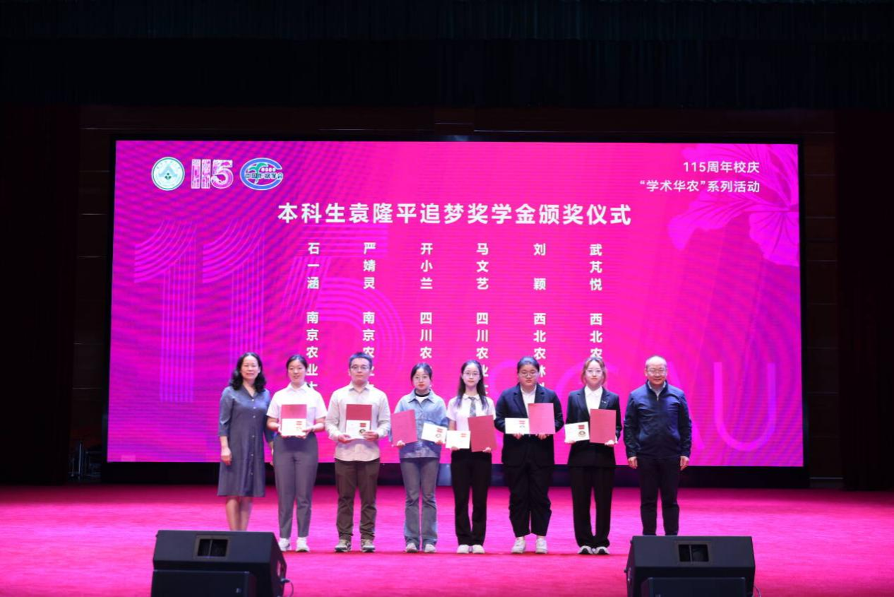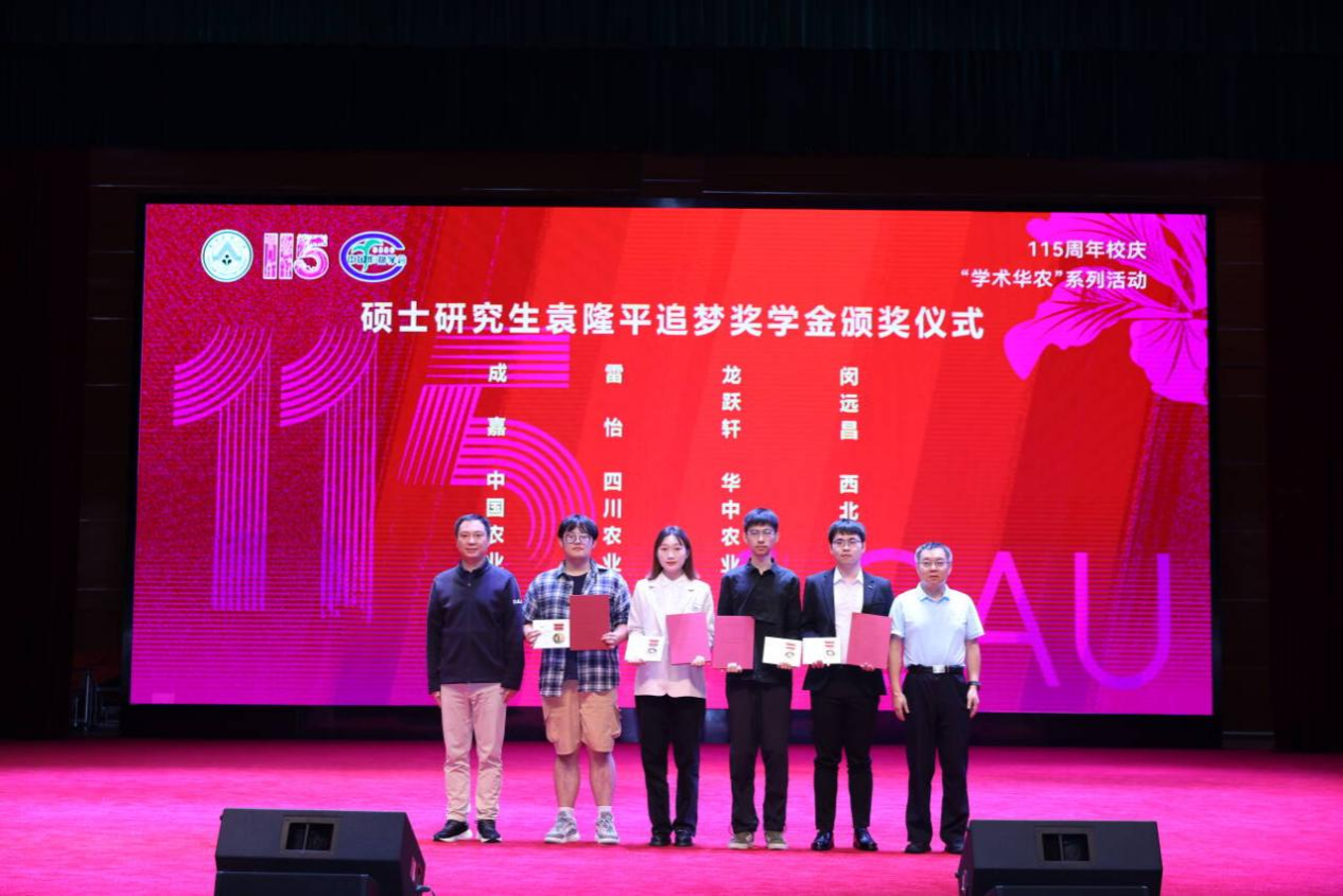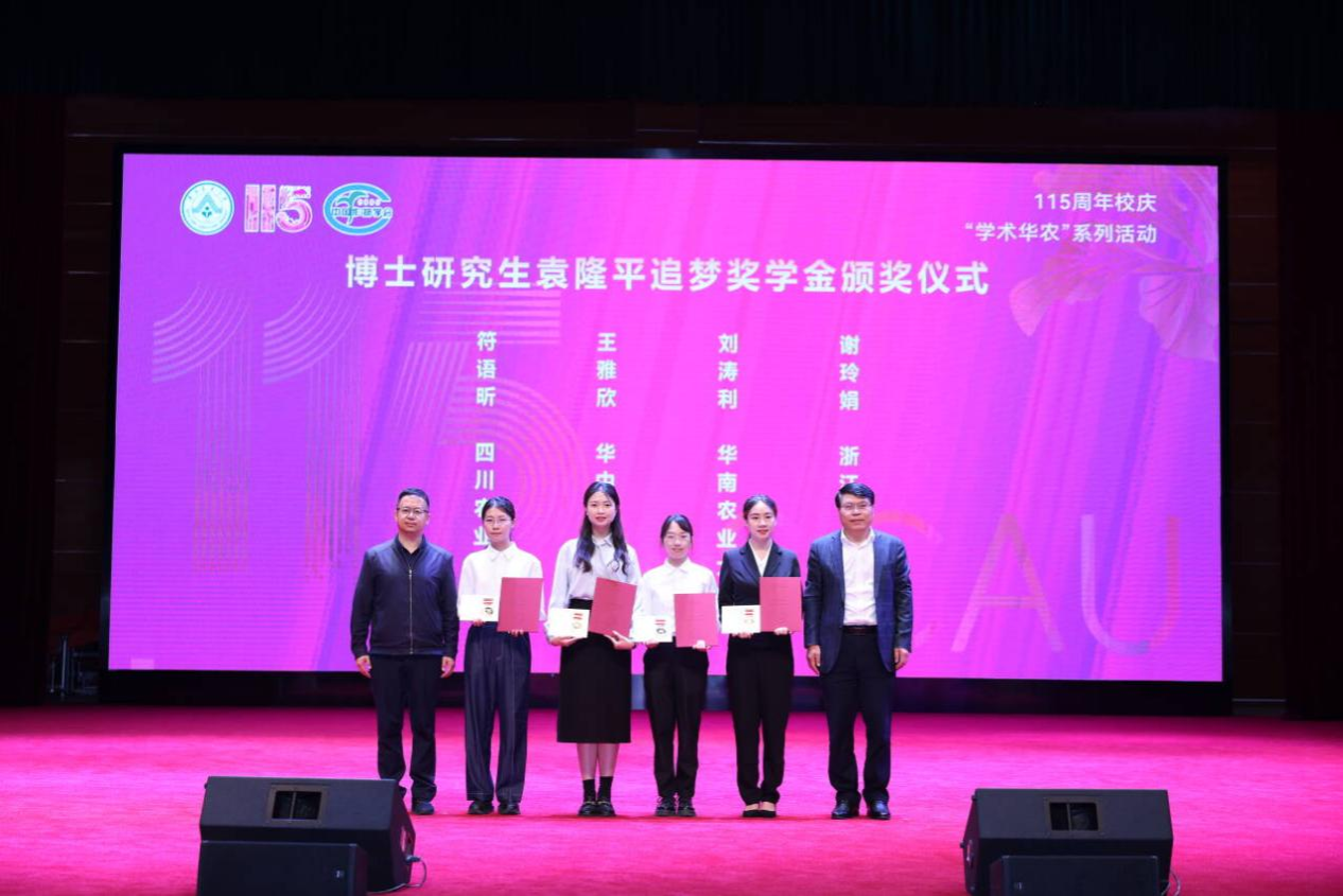 近日,2023-2024学年“袁隆平追梦奖学金”颁奖仪式在华南农业大学隆重举行。我校小麦研究所2020级博士研究生符语昕(导师王际睿教授)、best365官方网站登录入口硕士研究生雷怡(导师杨文钰教授、杨峰教授)、best365官方网站登录入口种子科学与工程专业2022级本科生马文艺及农学专业2022级本科生开小兰4名作物学科学子荣获本年度“袁隆平追梦奖学金”,并受邀到现场参加颁奖仪式,累计获得奖励7万元。