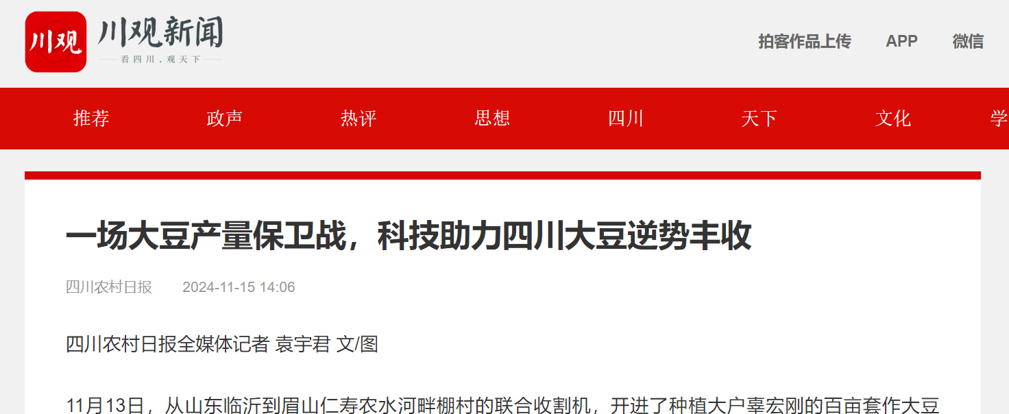 省农技推广总站副站长刘基敏告诉记者,近期,各地“天府粮仓·百县千片”净作与套作大豆高产示范片陆续启动测产验收,测产一线多地产量超过往年水平。