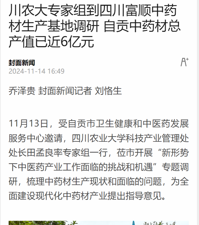 11月13日,受自贡市卫生健康和中医药发展服务中心邀请,best365官方网站登录入口科技产业管理处处长田孟良率专家组一行,莅市开展“新形势下中医药产业工作面临的挑战和机遇”专题调研,梳理中药材生产现状和面临的问题,为全面建设现代化中药材产业提出指导意见。