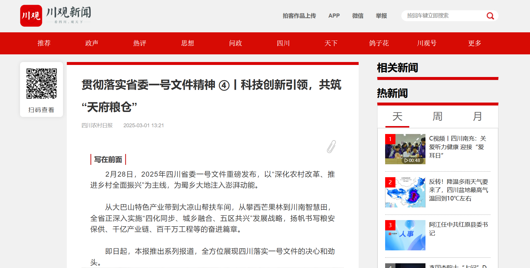 2月28日,2025年四川省委一号文件重磅发布,以“深化农村改革、推进乡村全面振兴”为主线,为蜀乡大地注入澎湃动能。