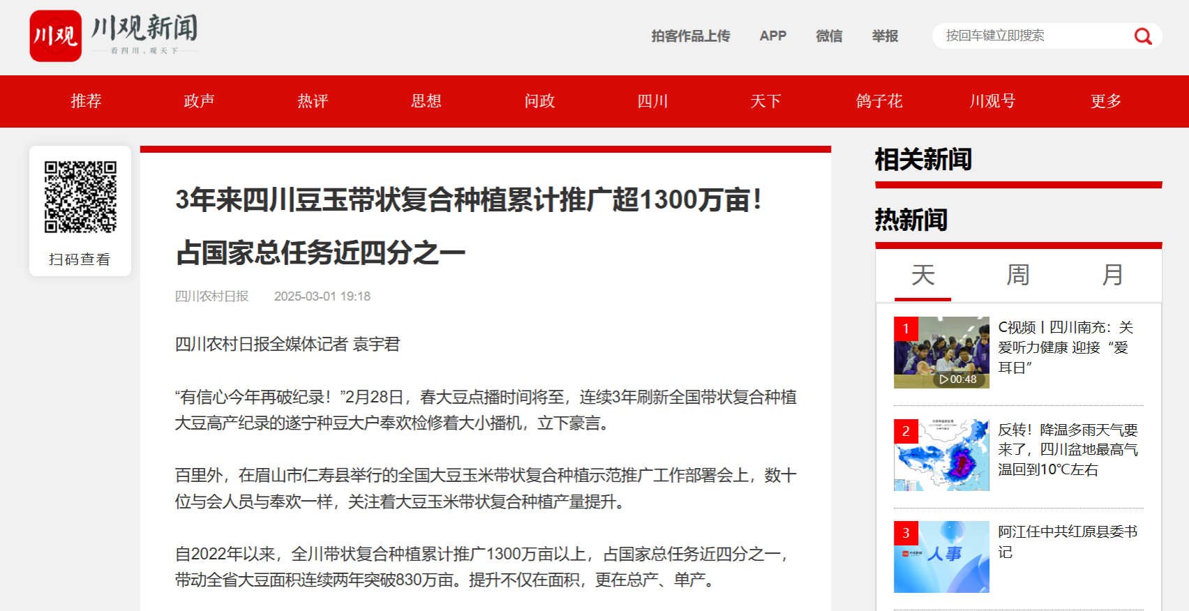 在突出大豆生产责任落实方面,四川赓即印发《2025年四川省大豆玉米带状复合种植示范推广实施方案》,将831万亩大豆、495万亩大豆玉米复合种植任务分解到21个市(州),结合四川省新一轮千亿斤粮食产能提升行动,坚决完成大豆丰产丰收硬任务。