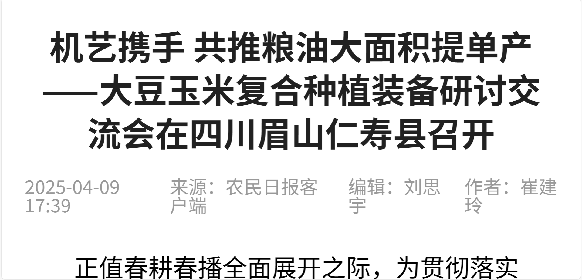 正值春耕春播全面展开之际,为贯彻落实《2025年全国粮油作物大面积单产提升实施方案》有关要求,4月1日,农业农村部农业机械化总站会同全国农业技术推广服务中心、四川省农业农村厅在四川省眉山市仁寿县举办大豆玉米复合种植装备研讨交流会暨丘陵山区净作玉米大豆机械化播种以及复合种植全程机械化现场演示,此次会议齐聚全国18个大豆玉米带状复合种植重点省份农技、农机推广机构代表,农业农村部南京农业机械化研究所、中国农业大学等科研单位代表,共同探讨机艺融合,加快复合种植及丘陵山区机具熟化完善和推广应用,推进粮油作物大面积提单产。