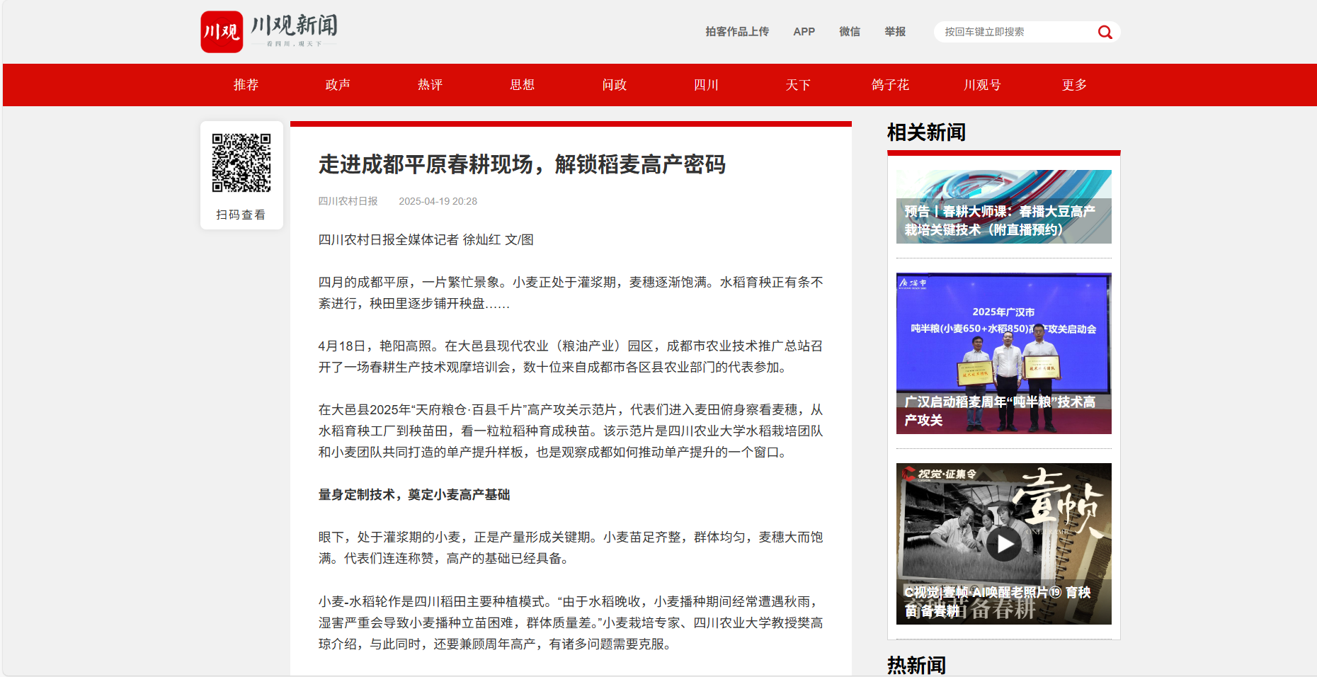在科技支撑下,成都平原上的稻麦与时间赛跑。再过20多天,麦子成熟,与此同时,秧苗达到移栽条件。水稻和小麦之间将完成高效接力,赓续描绘“天府粮仓”的丰收图景。