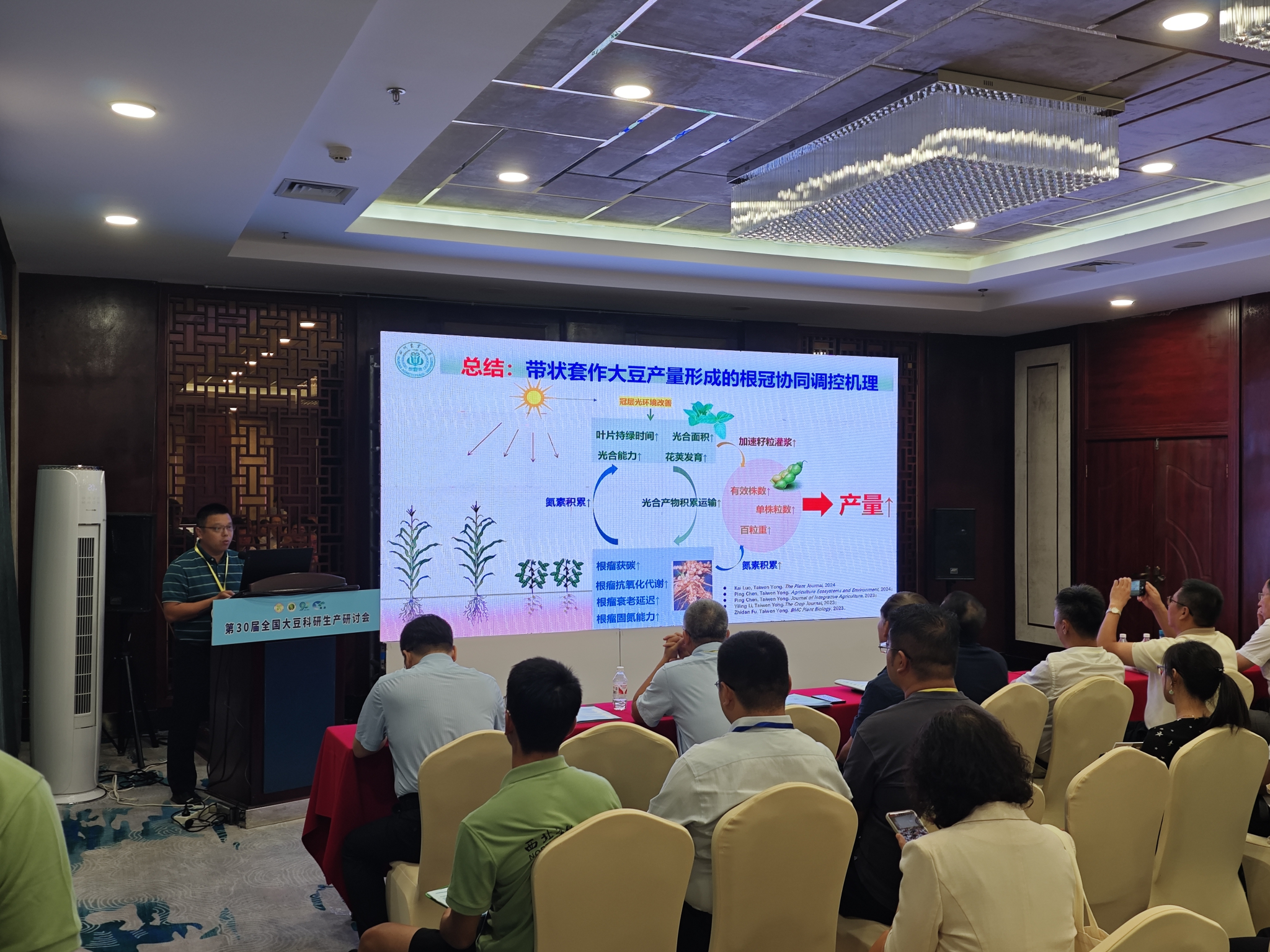 会上,雍太文在生产管理与产业分论坛以“带状套作大豆产量形成的根冠协同调控机理”为题作了汇报,详细介绍了带状套作大豆在恢复性生长期,通过延长叶片持绿期、延缓根瘤衰老而促进产量形成的机制,并与与会专家进行深入交流。在研究生论坛中,2022级博士生林萍作题为“根系分泌物对带状复合种植大豆根瘤生长发育的生理调控机理”的报告,并获大会优秀汇报奖。
