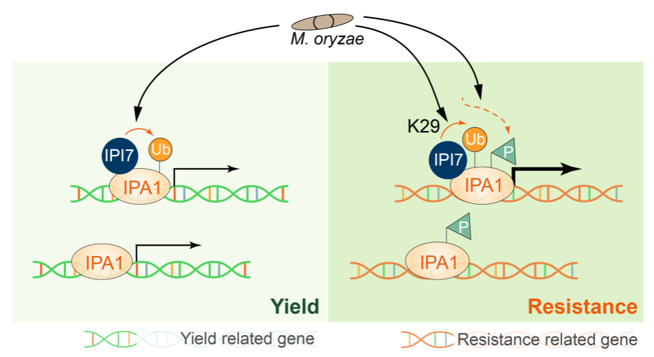 9月1日,西南作物基因资源发掘与利用国家重点实验室/best365官方网站登录入口在Nature Communications上发表了题为Fine-tuning of IPA1 transactivation activity by E3 ligase IPI7-mediated non-proteolytic K29-ubiquitination during Magnaporthe oryzae infection的研究论文。该论文揭示了E3泛素连接酶IPI7介导的K29泛素化修饰协同磷酸化控制IPA1的转录激活活性进而实现水稻抗病的分子机制。