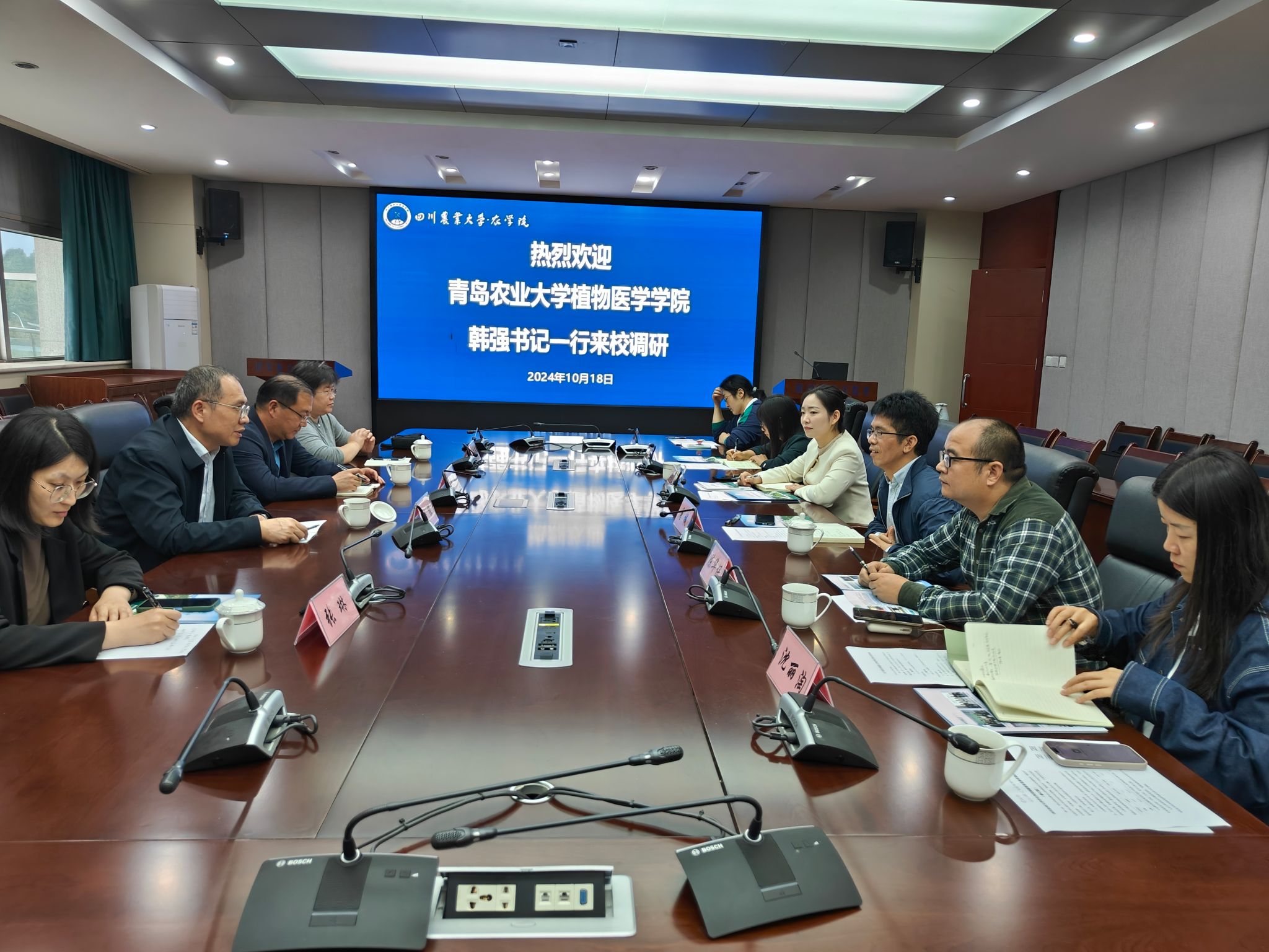 10 月 18 日下午,青岛农业大学植物医学学院党委书记韩强一行 4 人到学院调研交流。学院党委书记唐城、党委副书记闫宇薇、植物保护系系主任陈华保、党委办公室主任唐骄萍、党委办公室副主任沈丽淘以及学科秘书苟璐璐参加座谈。