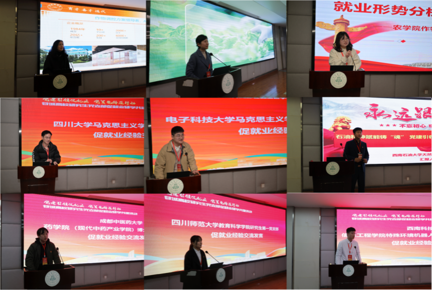 经验交流环节,我校best365官方网站登录入口作物栽培学与耕作学硕士研究生党支部书记郑亭、四川大学马克思主义学院博士第二党支部刘国元、电子科技大学马克思主义学院硕士研究生第一党支部冯司雨、西南石油大学石油与天然气工程学院天然气现代产业博士党支部张继、成都中医药大学药学院(现代中药产业学院)博士研究生党支部张盛林、四川师范大学教育科学学院研究生第一党支部陈子怡、西南科技大学信息工程学院特殊环境机器人科学与技术研究生党支部陈尔达主要围绕就业形势、“党建+就业”探索路径以及“如何发挥党员先锋模范作用,投身服务国家战略需求”等主题进行了深入交流研讨。两家企业代表主要围绕企业人才需求与培养路径,并结合优秀个人发展案例展开了精彩的分享,为研究生的未来发展提供了多维度的思路与指引。