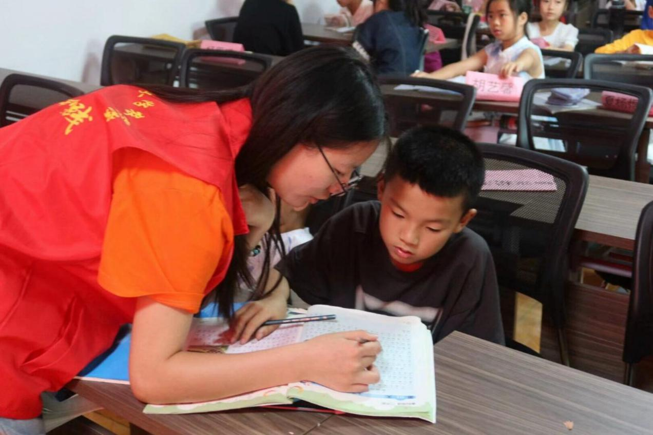 图为蒙秋弘为一名小朋友讲题