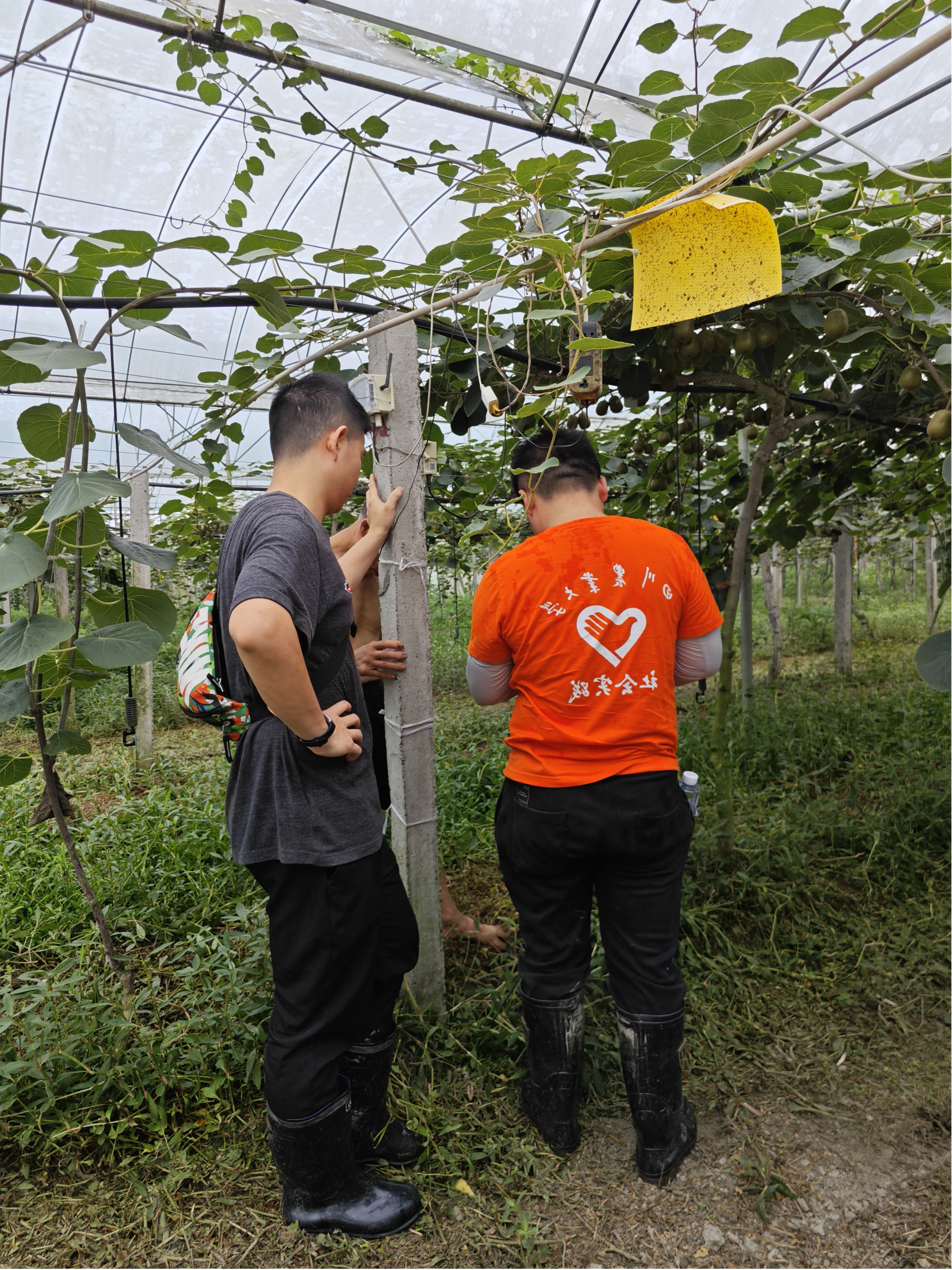 在龚国淑的带领下,团队成员首先对四川平坝猕猴桃产区的病害情况进行了调查与记录,并向农户了解了困扰产业发展的其它问题。调查发现,目前田间褐斑病的发病率为73.5%,相比于往年同时期严重许多。询问原因得知,主要是由于近期连续降雨,致使相应化学药剂难以有效施入田间,而又无其它科学方法防治。针对此问题,团队成员现场讨论了解决方案:建议农户避雨栽培的猕猴桃要严格控制两次喷洒杀菌药剂的时间,阻止病情近一步发展,同时近期要注意少浇水,降低果园湿度;露天栽培的猕猴桃要充分利用雨停的间隙,喷施高效杀真菌剂,保证施药后4小时之内无雨水即可;针对果园杂草丛生的现象,建议使用物理覆膜防治的措施,以降低人工除草成本。对当地困难群众,实践过程中,服务团也无偿向其赠送了相关防治药剂及除草生物被膜,助力农户增收。