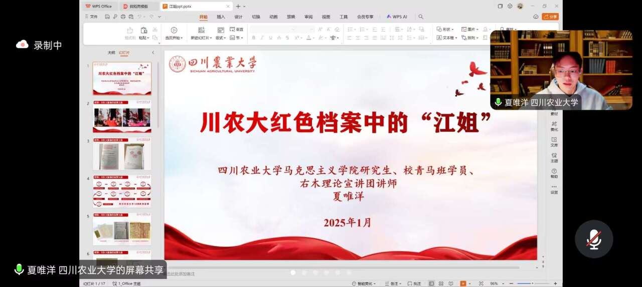 在活动开展初期,团队邀请第11期青马班成员、右木理论宣讲团成员、马克思主义学院23级研究生夏唯洋开展线上红色宣讲。此次宣讲以川农大精神中的“爱国”为关键词,讲述了川农的红色基因,特别强调了江姐在抗战时期的成长与革命经历以及宁死不屈的英雄气概。该宣讲不仅为实践团队后续活动的展开提供了重要的知识基础,还提高了团队成员的思想觉悟。