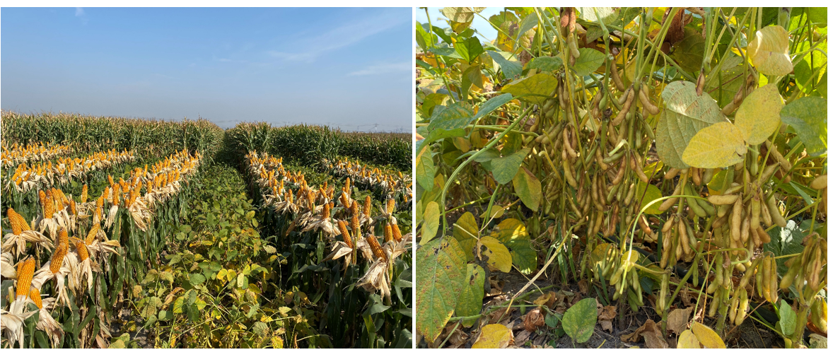 观摩现场,金灿灿的玉米籽粒饱满,豆荚挂满枝头,呈现出一派向好的丰收景象。田间测产结果显示,玉米大豆带状间作种植模式下,选择玉米品种MY76和大豆品种齐黄34,再结合4行大豆搭配2行玉米,玉米理论亩产854.83公斤和大豆理论亩产111.75公斤,实现玉米大豆协同增产增效。